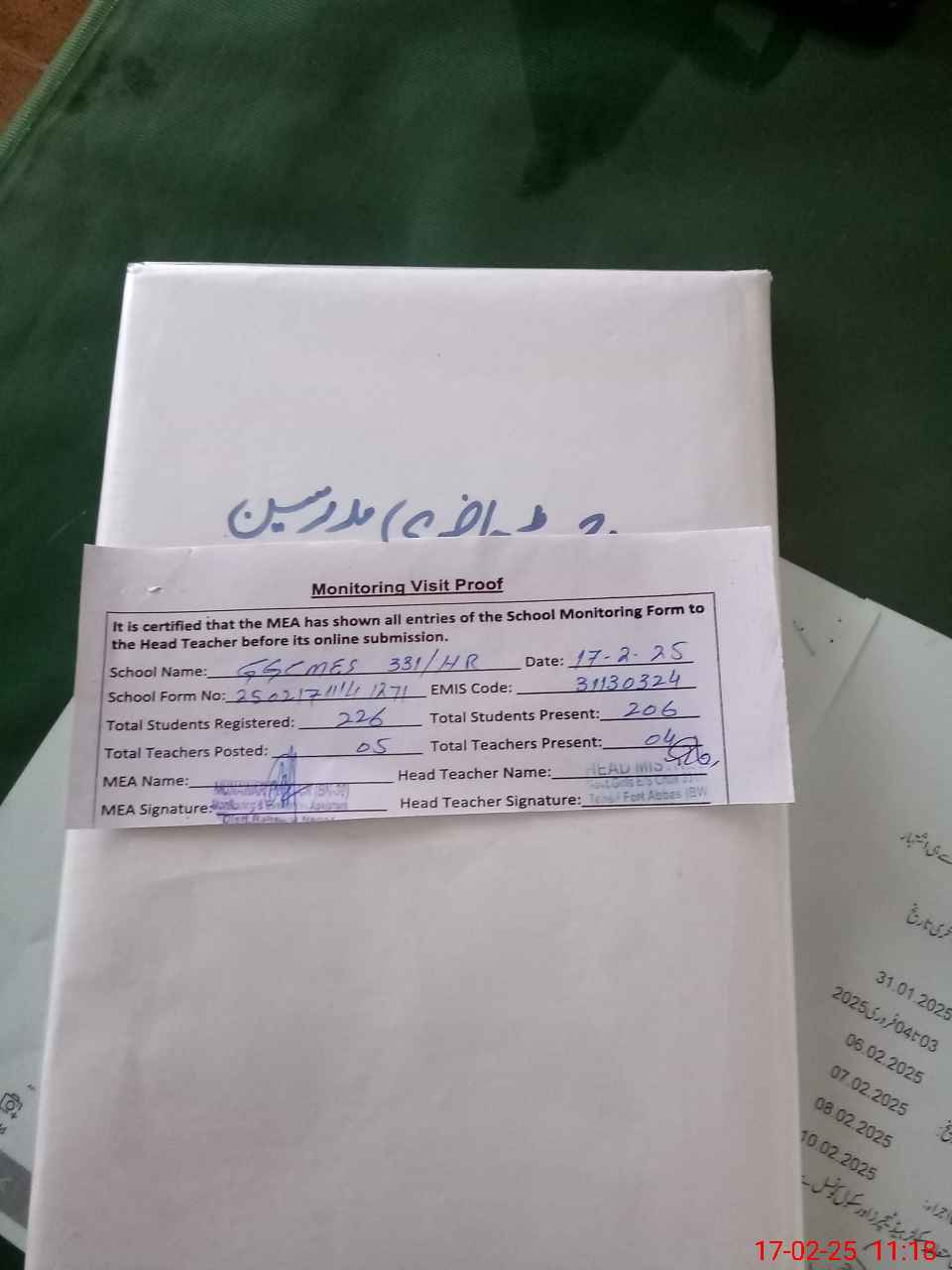 | Attendance Register | Head Teacher | MEA with School | Visit Proof |