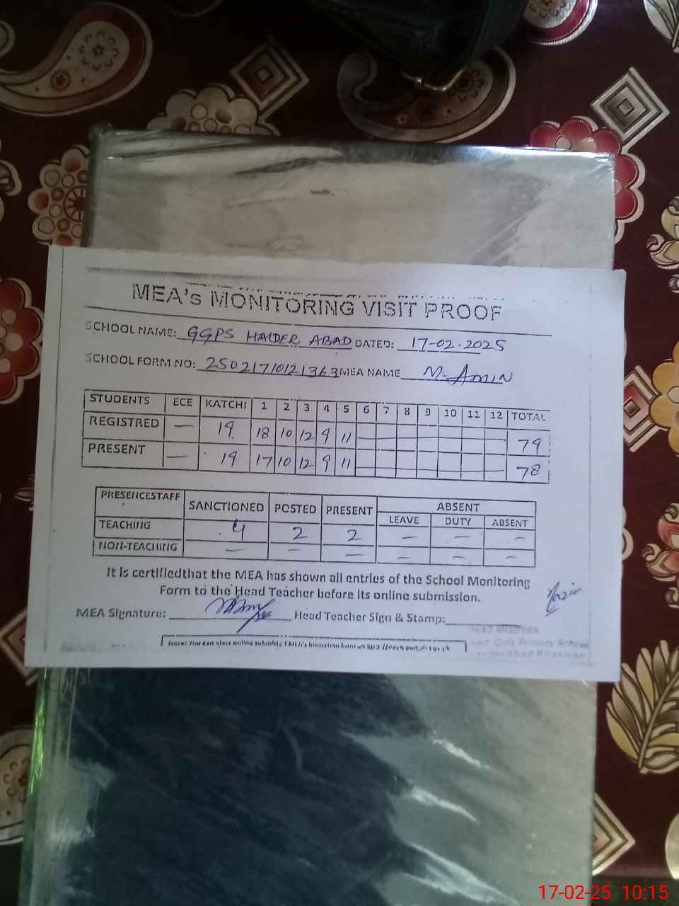 | Attendance Register | Head Teacher | MEA with School | Visit Proof |