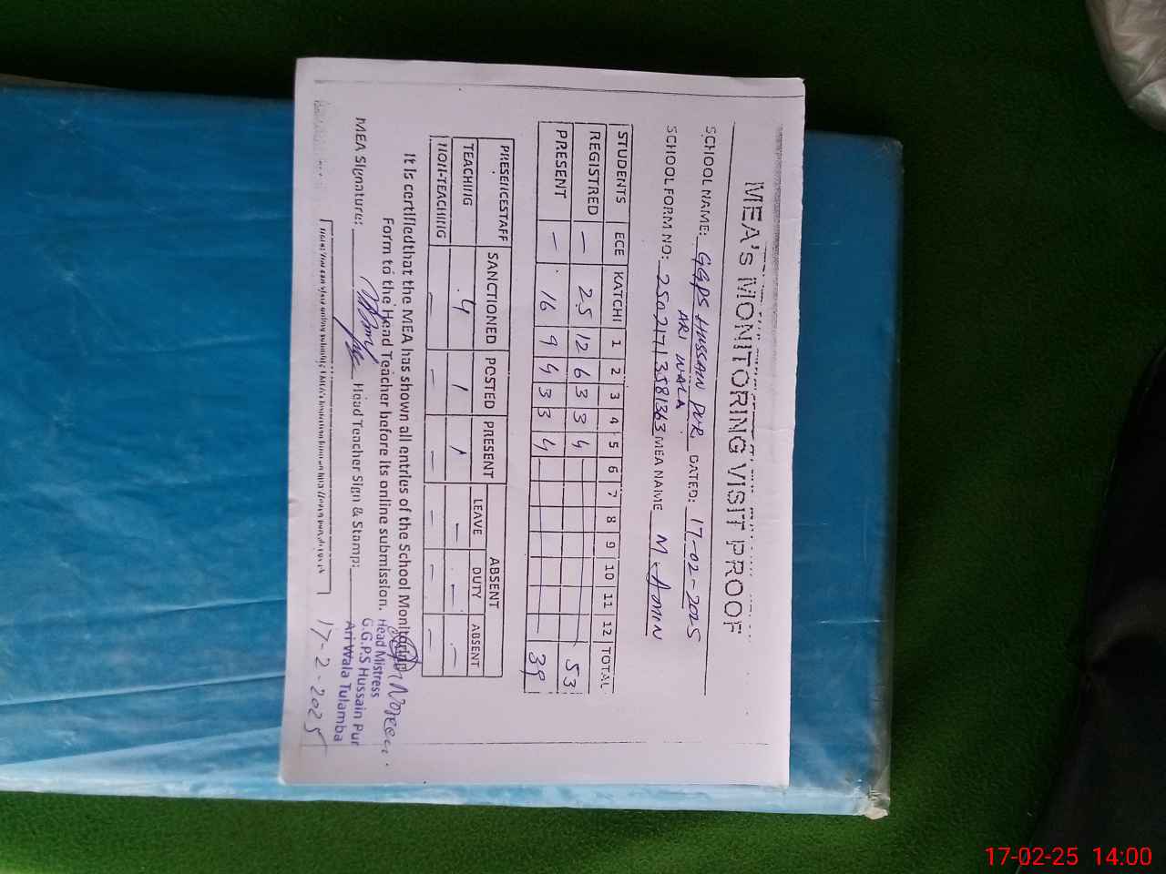 | Attendance Register | Head Teacher | MEA with School | Visit Proof |