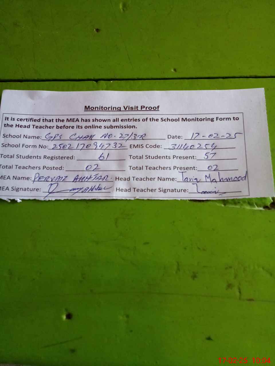 | EMIS Code: 31140254 | Name of School: GPS CHAK NO.27/3-R | |||