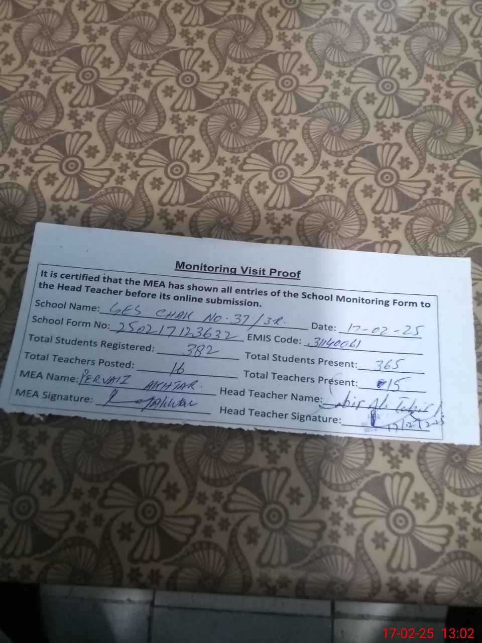 | Attendance Register | Head Teacher | MEA with School | Visit Proof |