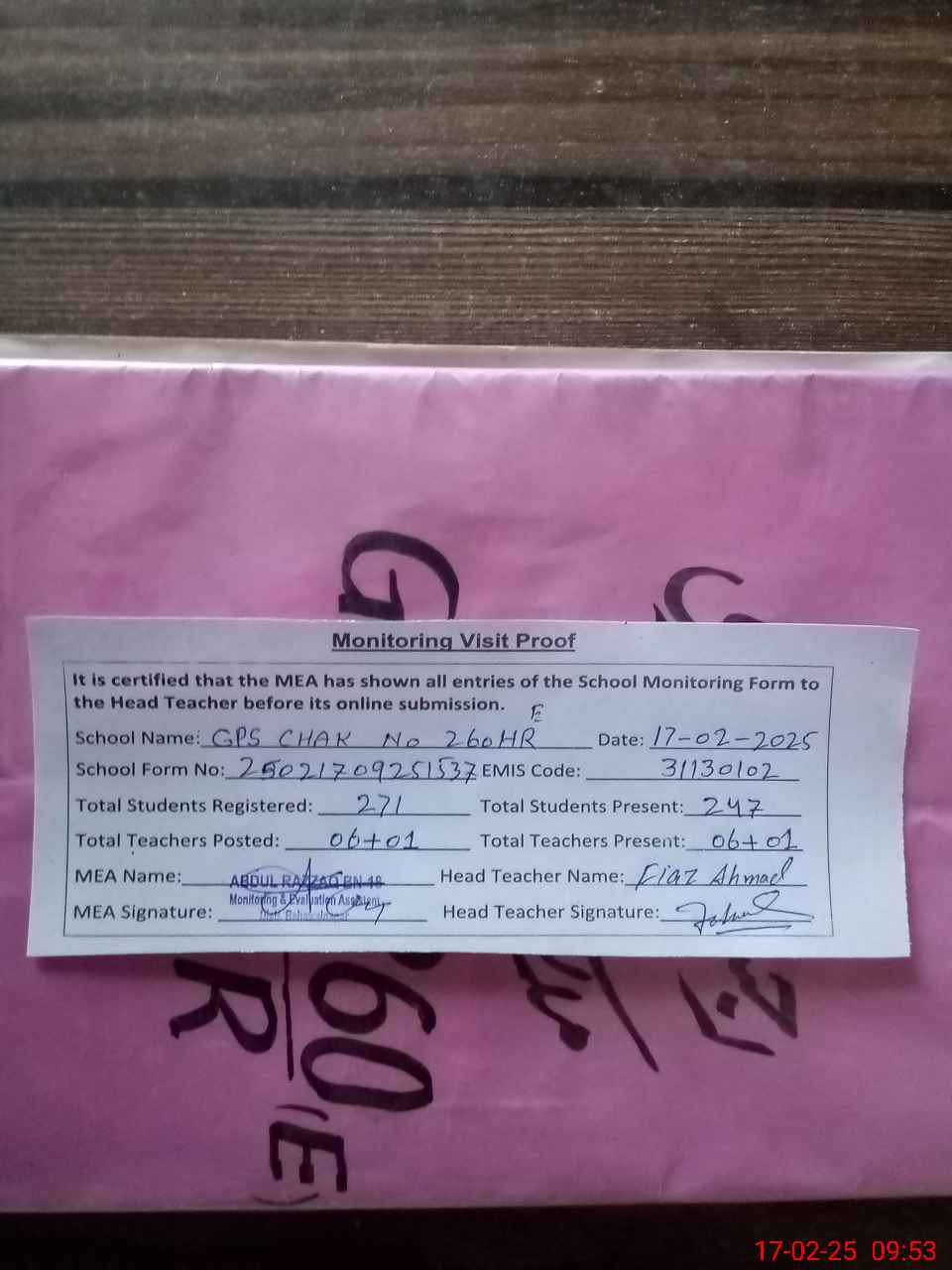 | Attendance Register | Head Teacher | MEA with School | Visit Proof |