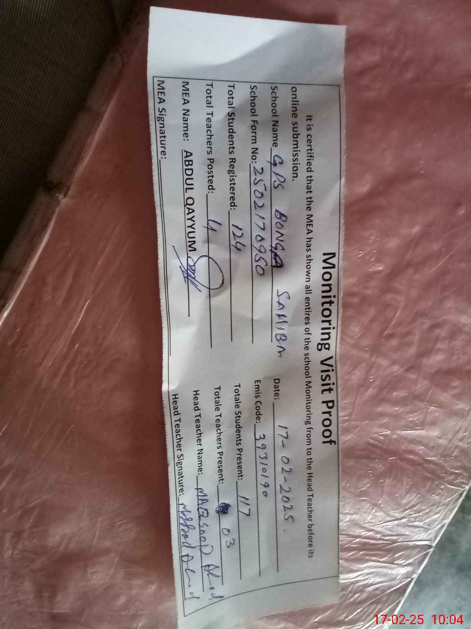 | Attendance Register | Head Teacher | MEA with School | Visit Proof |