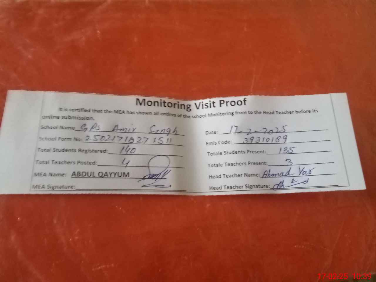 | Attendance Register | Head Teacher | MEA with School | Visit Proof |