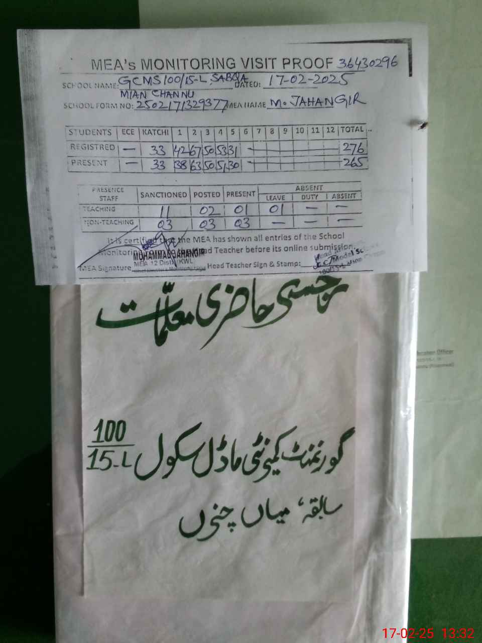 | EMIS Code: 36430296 | Name of School: GCMS 100/15-L SABQA, MIAN CHANNU | |||