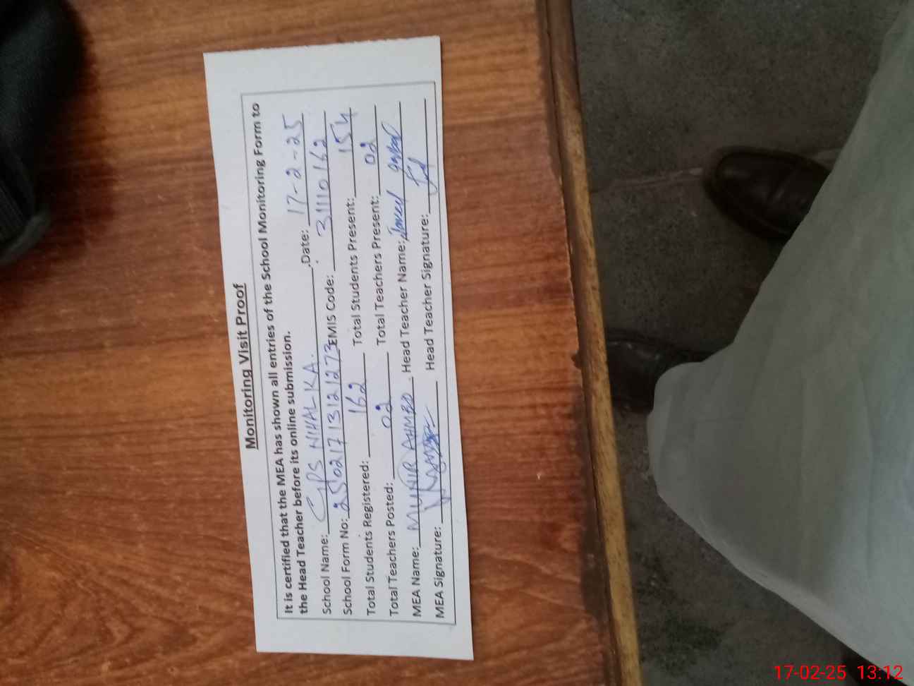 | Attendance Register | Head Teacher | MEA with School | Visit Proof |
