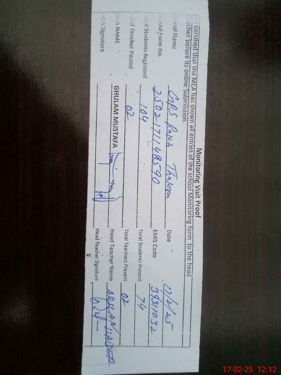 | Attendance Register | Head Teacher | MEA with School | Visit Proof |
