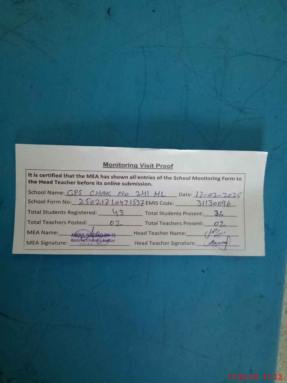 | EMIS Code: 31130096 | Name of School: GPS CHAK NO. 241/HL | |||