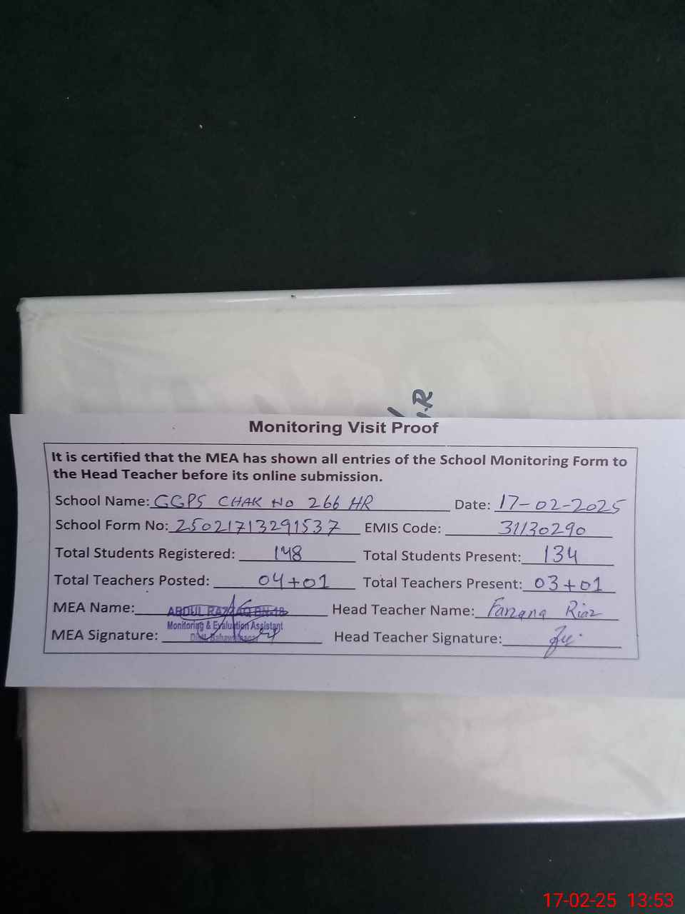 | EMIS Code: 31130290 | Name of School: GGPS CHAK NO 266 HR | |||