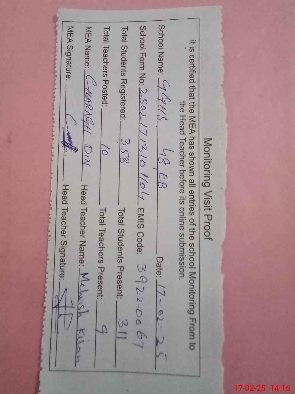 | Attendance Register | Head Teacher | MEA with School | Visit Proof |