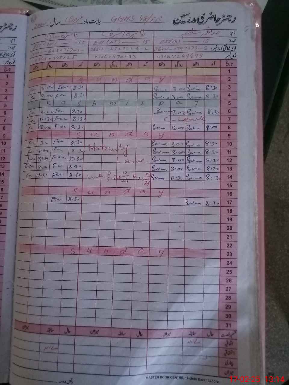 | CNIC | Full Name | Designation | R/C | Absence During Last Calender Month |