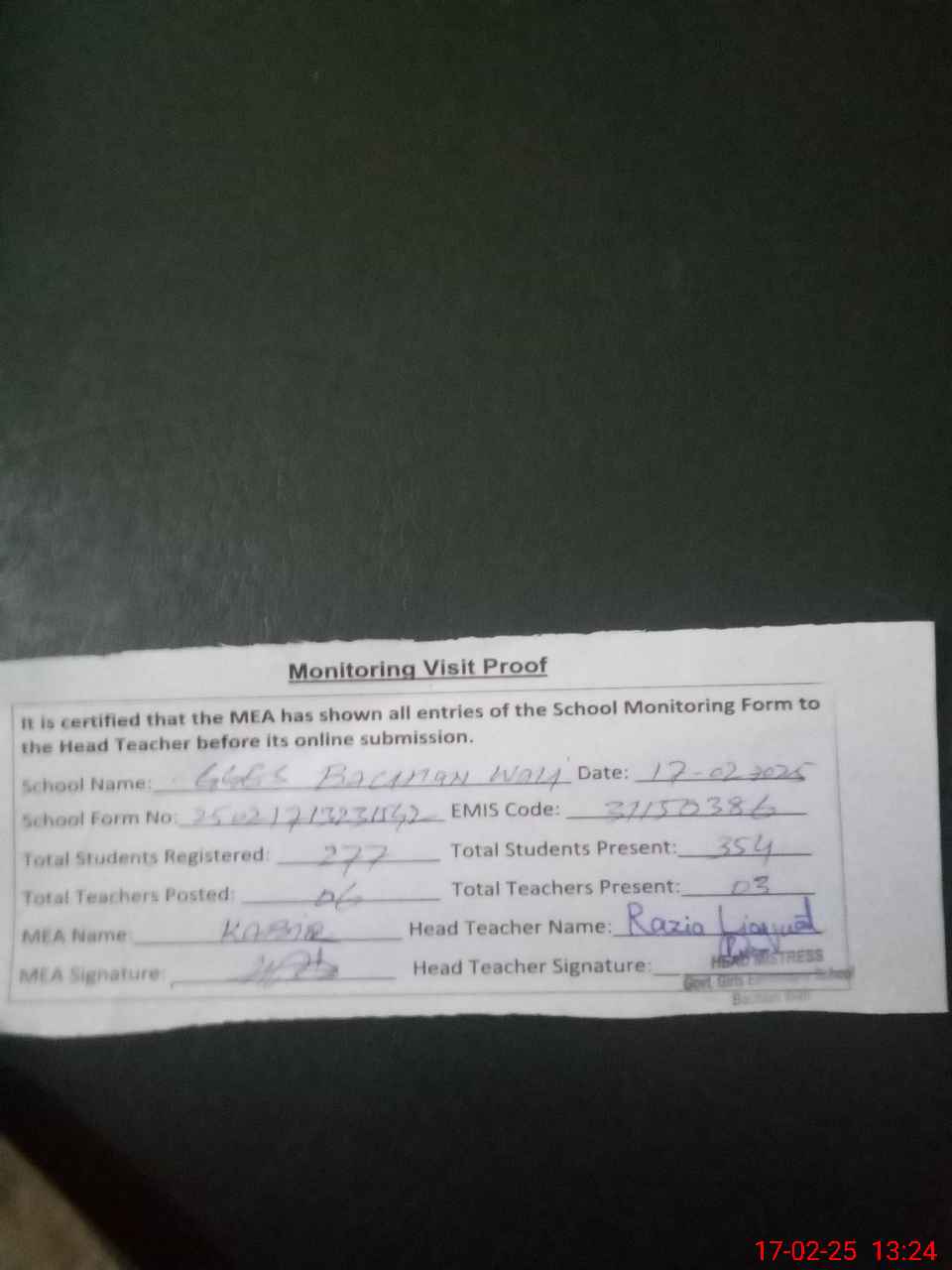 | Attendance Register | Head Teacher | MEA with School | Visit Proof |