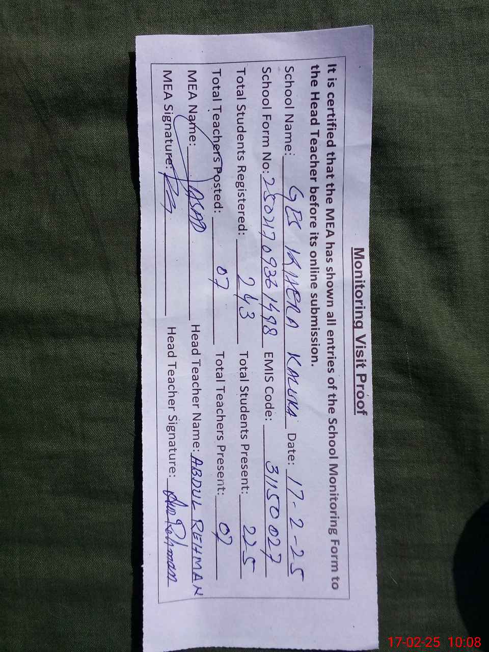 | Attendance Register | Head Teacher | MEA with School | Visit Proof |