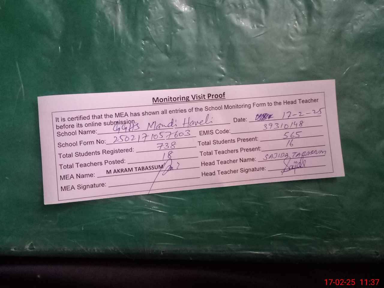 | EMIS Code: 39310148 | Name of School: GGHS MANDI HAVELI | |||