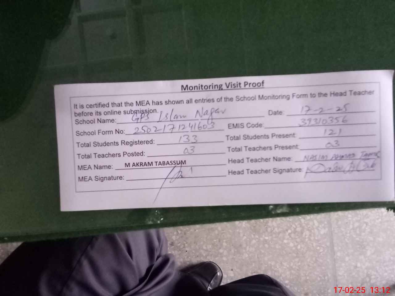 | EMIS Code: 39310356 | Name of School: GPS ISLAM NAGAR | |||