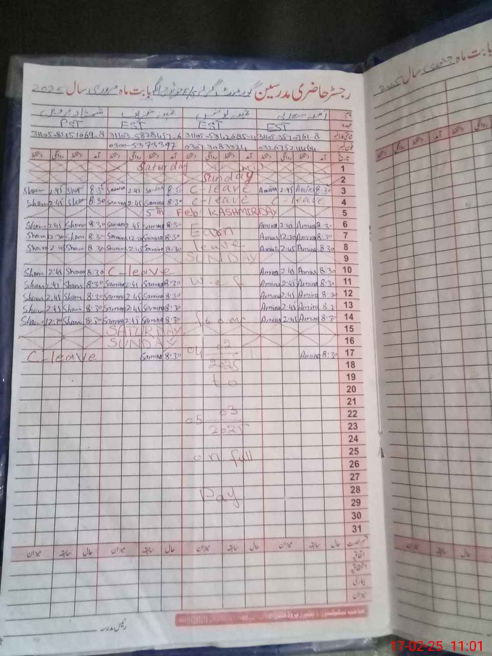 | CNIC | Full Name | Designation | R/C | Absence During Last Calender Month |