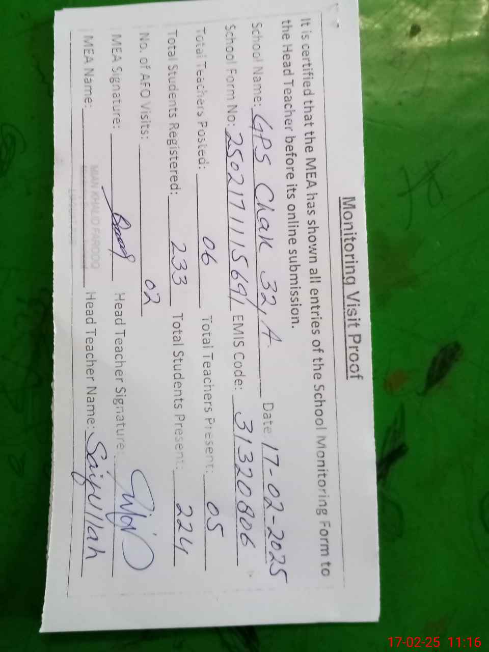 | Attendance Register | Head Teacher | MEA with School | Visit Proof |
