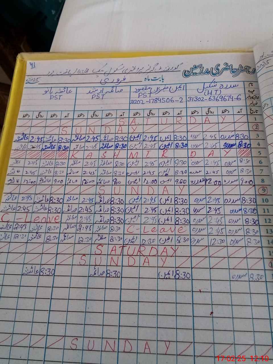 | Name: SI**** SH**** Designation: (School Headmaster's/Headmistress's) PST Phone/Cell Number: 03**** |