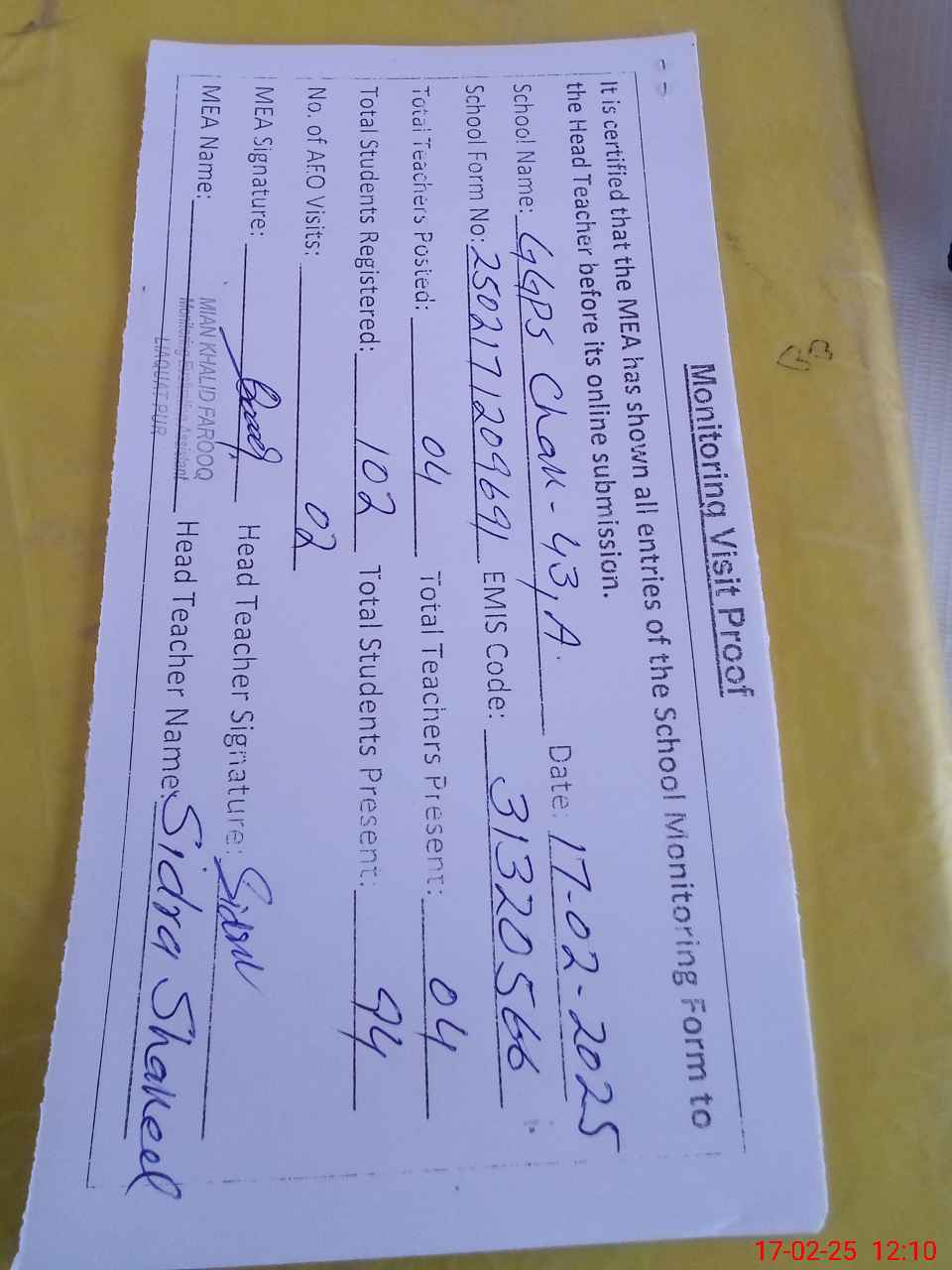 | Attendance Register | Head Teacher | MEA with School | Visit Proof |