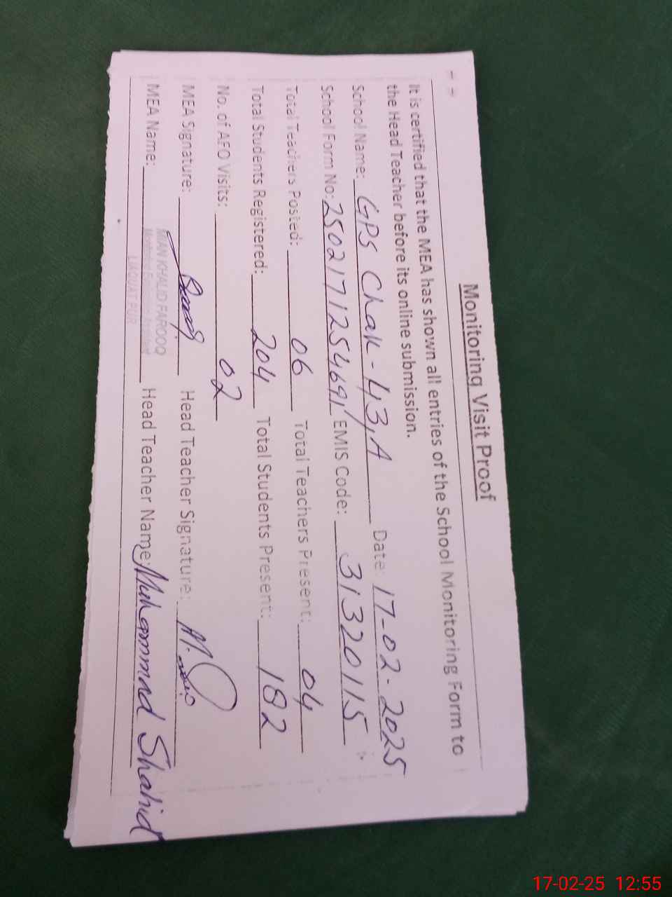 | Name: MU**** SH**** Designation: (School Headmaster's/Headmistress's) PST Phone/Cell Number: 03**** |