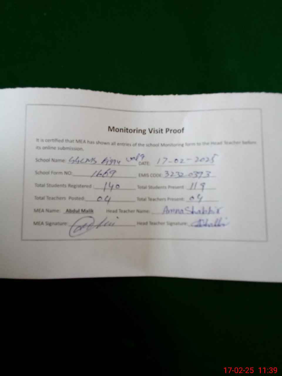| EMIS Code: 32320393 | Name of School: GGCMS EISAN WALA | |||