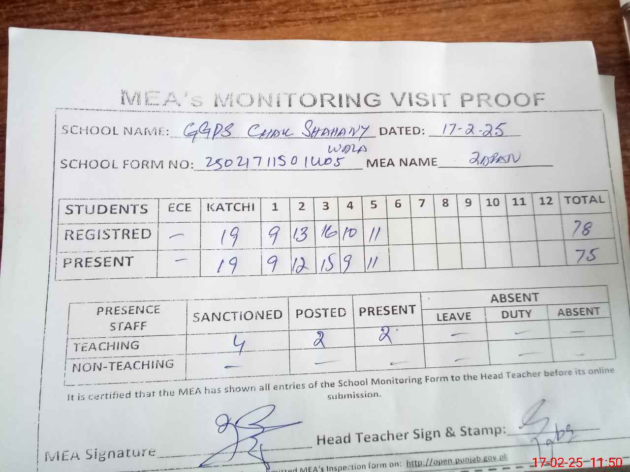 | Attendance Register | Head Teacher | MEA with School | Visit Proof |