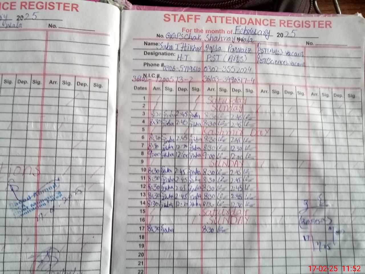 | Name: SA**** IF**** Designation: (School Headmaster's/Headmistress's) ESE (SCI-MATH) Phone/Cell Number: 03**** |