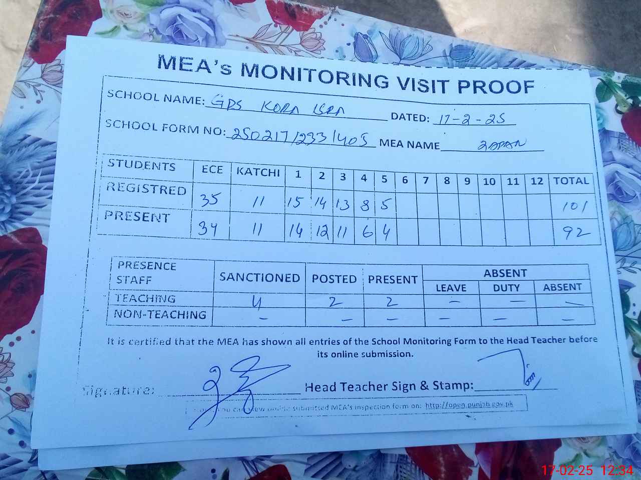 | Attendance Register | Head Teacher | MEA with School | Visit Proof |