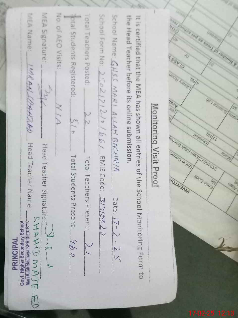 | Certified that this School was Inspected by the Undersigned MEA/DMO Today and the Information Stated Above is as Per Record. | |||||