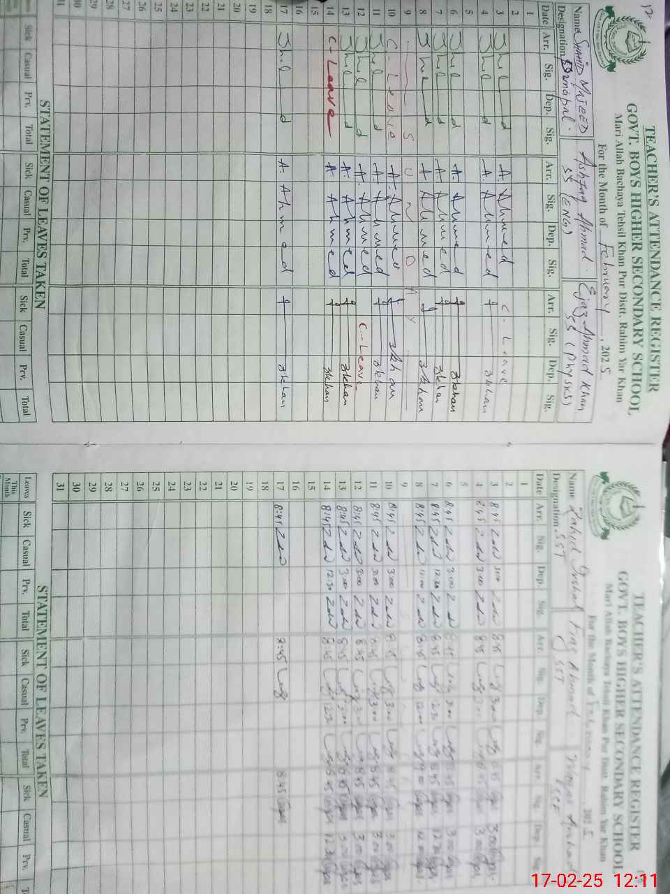 | CNIC | Full Name | Designation | R/C | Absence During Last Calender Month |