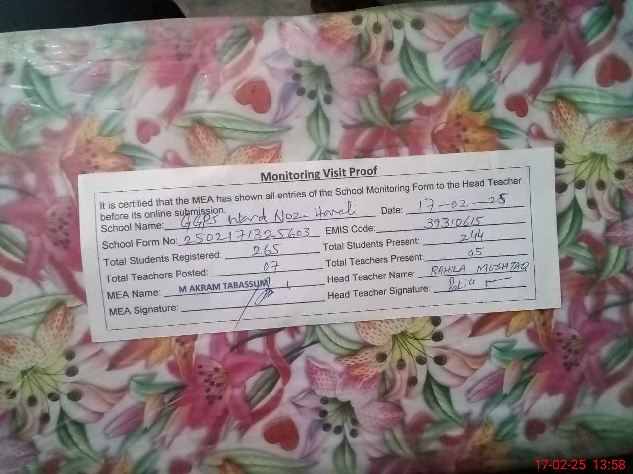 | Certified that this School was Inspected by the Undersigned MEA/DMO Today and the Information Stated Above is as Per Record. | |||||