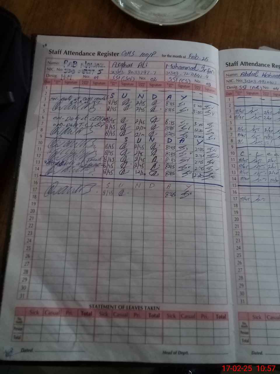 | CNIC | Full Name | Designation | R/C | Absence during last cal. month |