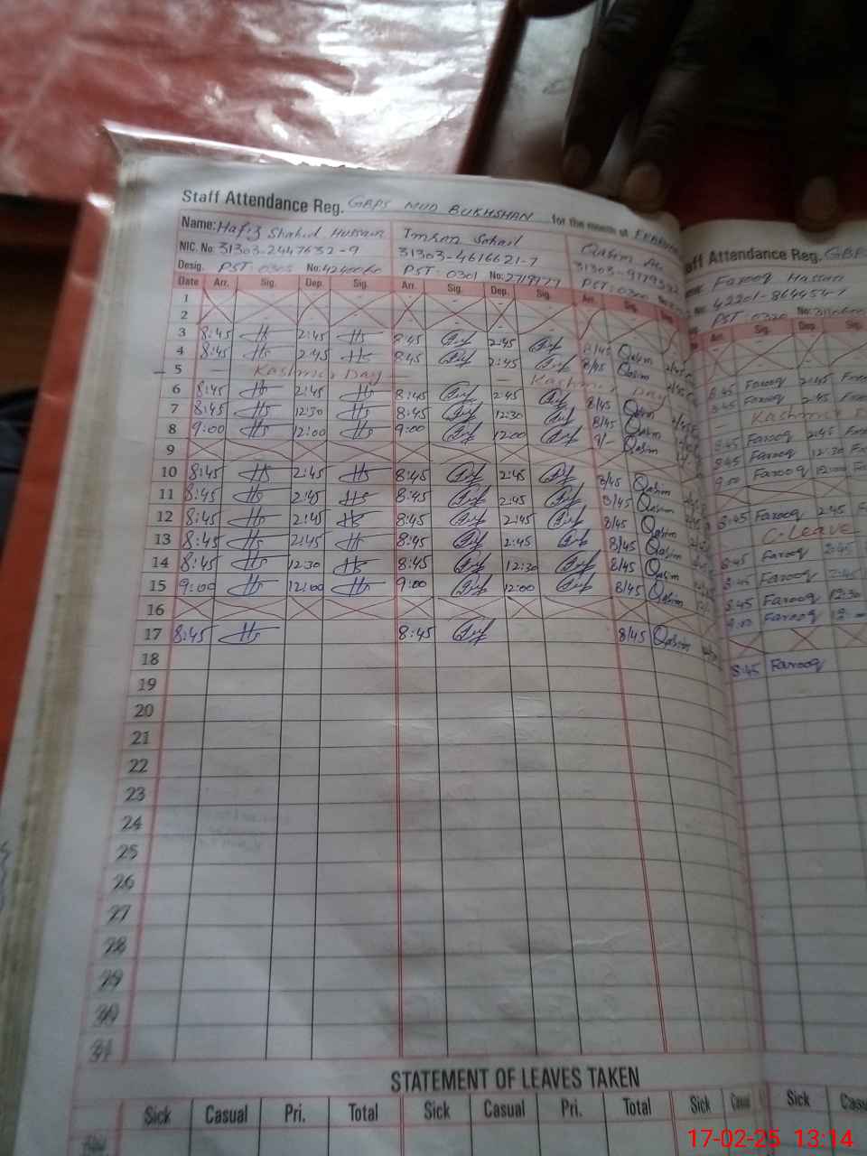 | CNIC | Full Name | Designation | R/C | Absence during last cal. month |