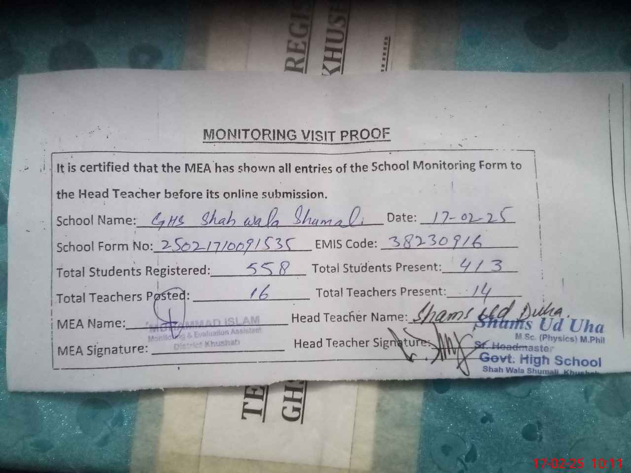 | EMIS Code: 38230916 | Name of School: GHS SHAH WALA SHUMALI | |||