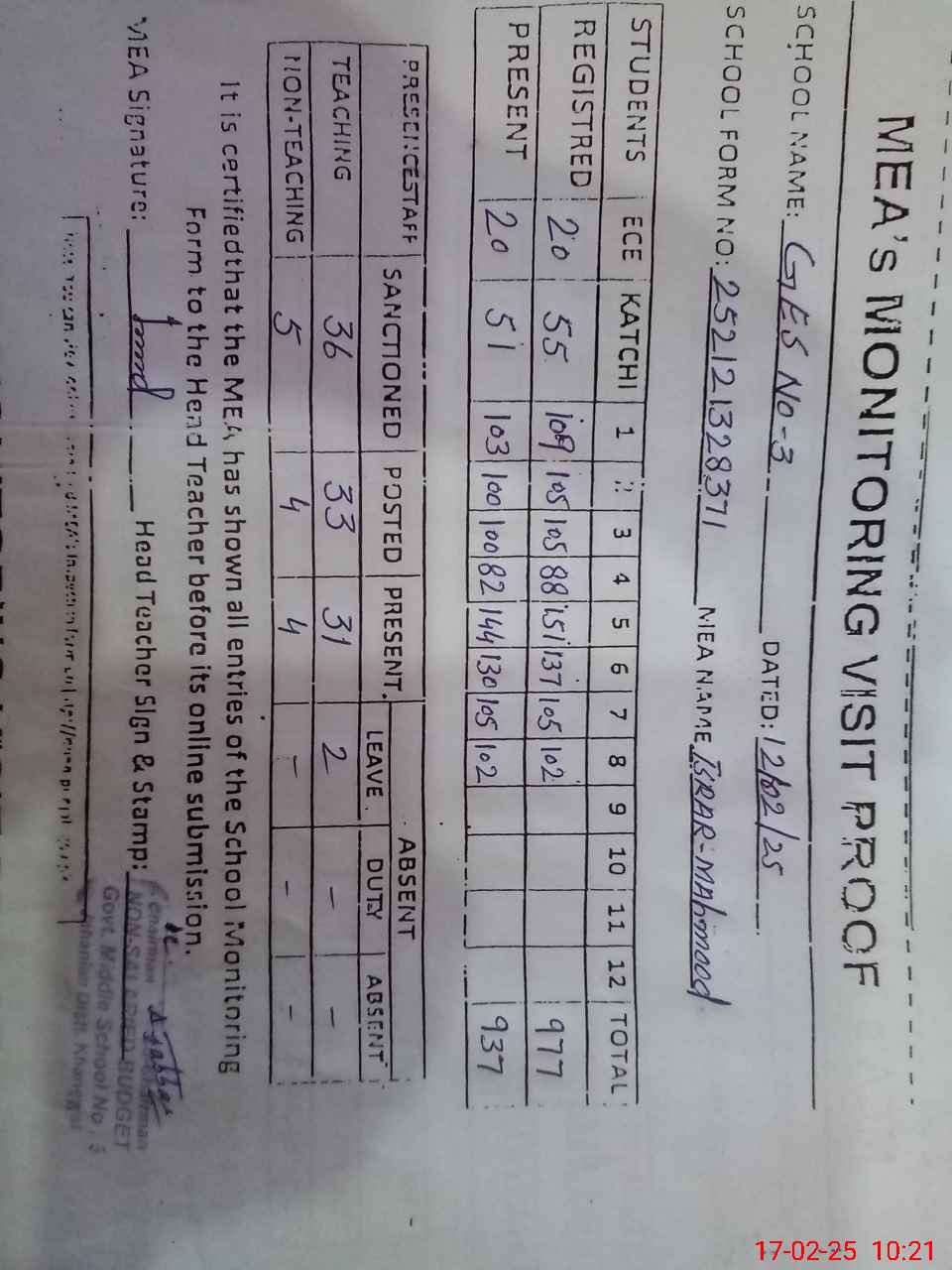 | Attendance Register | Head Teacher | MEA with School | Visit Proof |