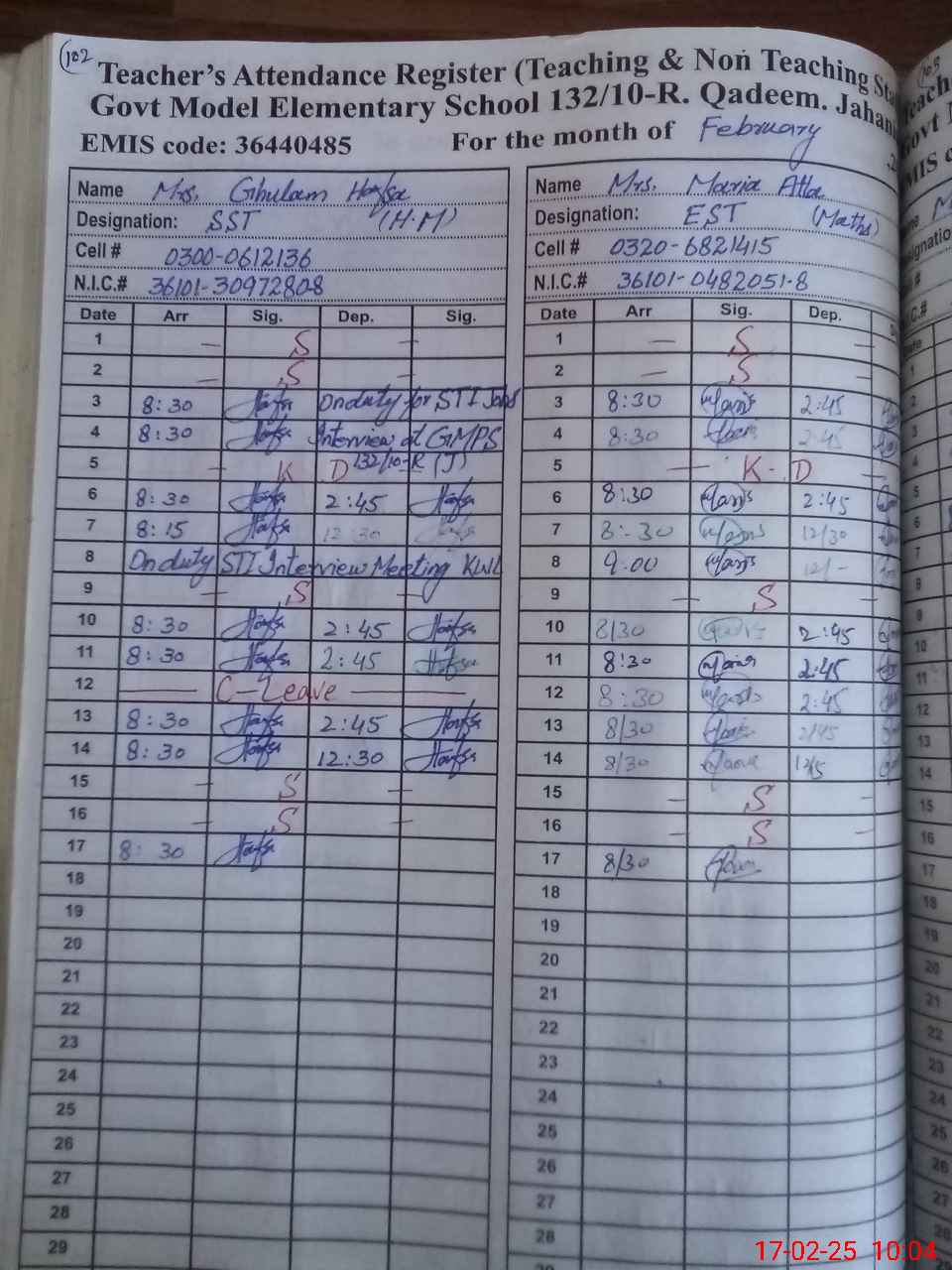 | CNIC | Full Name | Designation | R/C | Absence During Last Calender Month |
