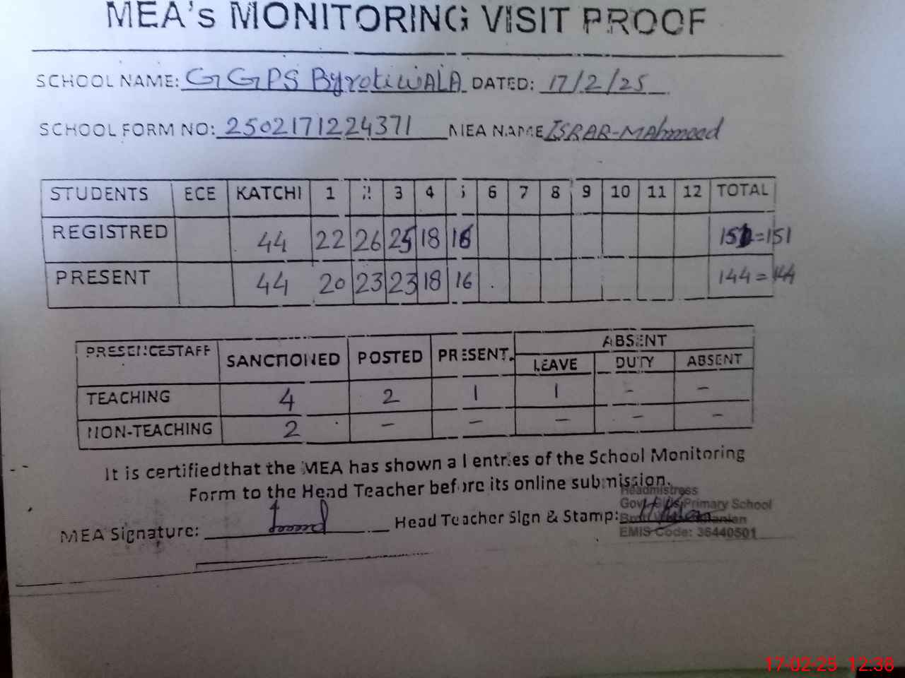 | Attendance Register | Head Teacher | MEA with School | Visit Proof |