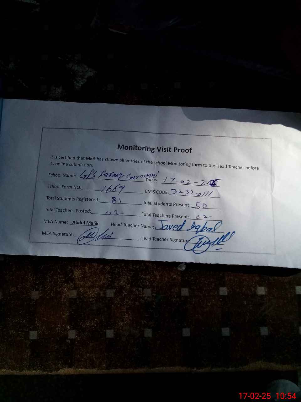 | Attendance Register | Head Teacher | MEA with School | Visit Proof |