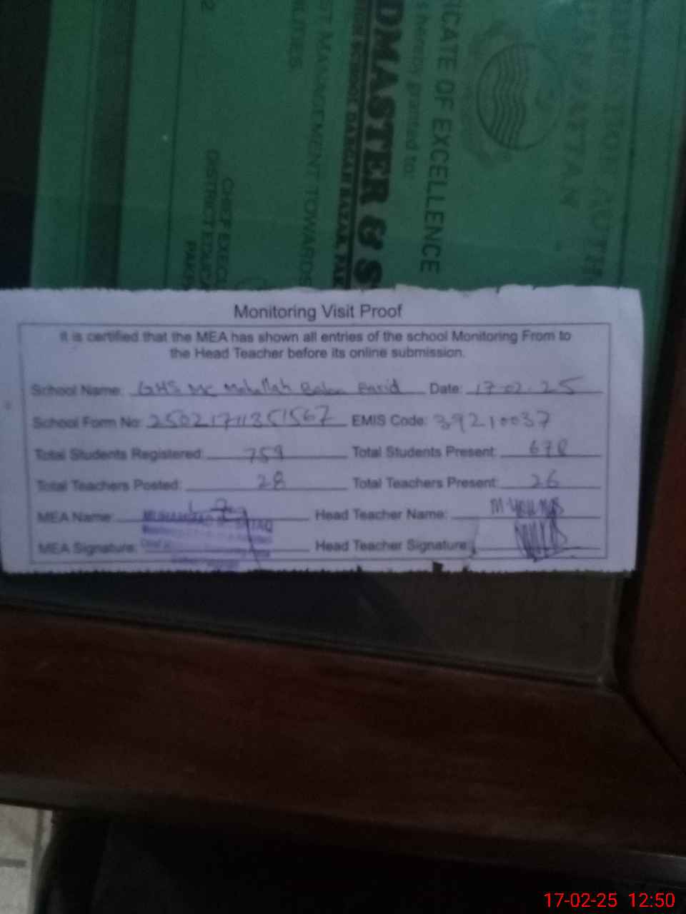 | Attendance Register | Head Teacher | MEA with School | Visit Proof |