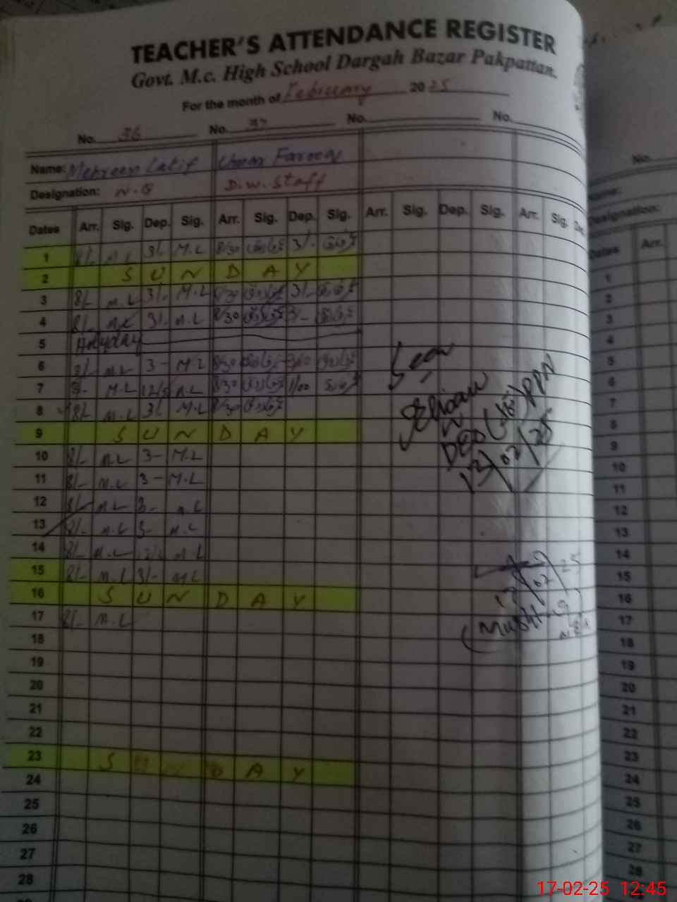 | CNIC | Full Name | Designation | R/C | Absence During Last Calender Month |