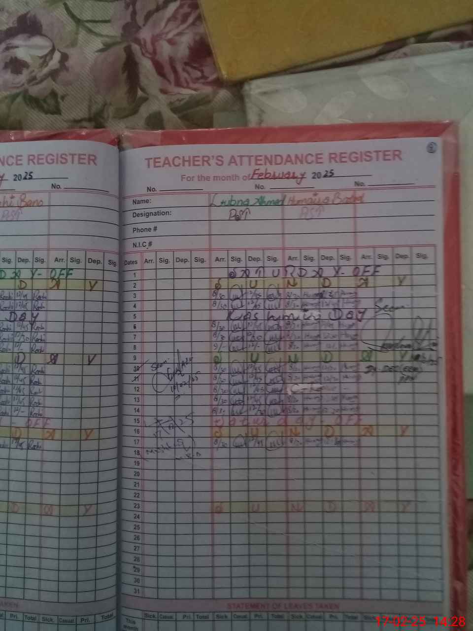 | CNIC | Full Name | Designation | R/C | Absence During Last Calender Month |