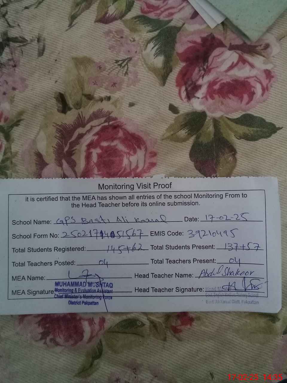 | Attendance Register | Head Teacher | MEA with School | Visit Proof |
