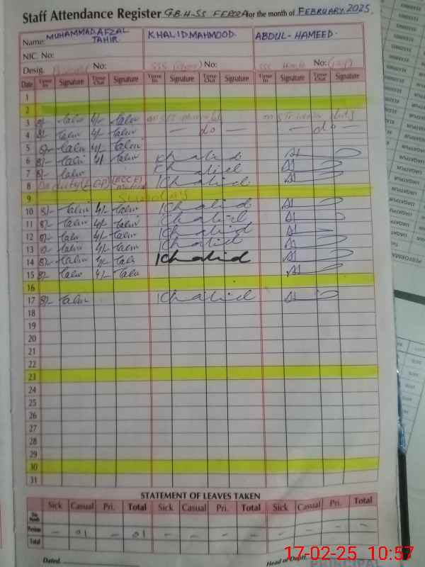 | CNIC | Full Name | Designation | R/C | Absence During Last Calender Month |