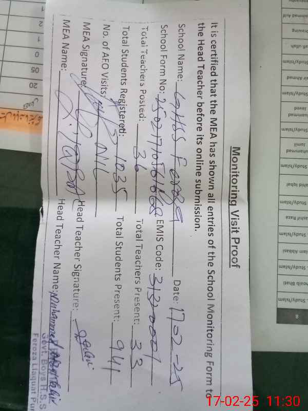 | EMIS Code: 31320001 | Name of School: GHSS FEROZAA | |||