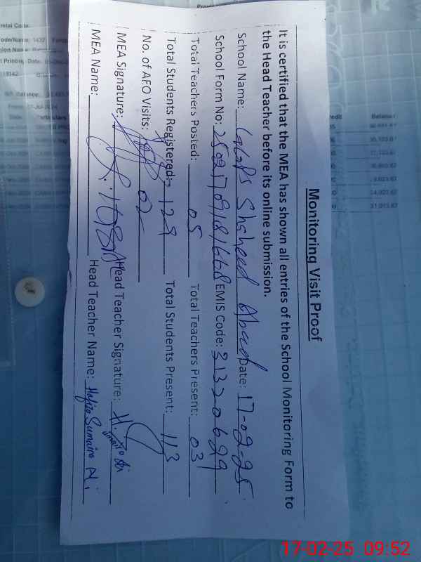 | Attendance Register | Head Teacher | MEA with School | Visit Proof |
