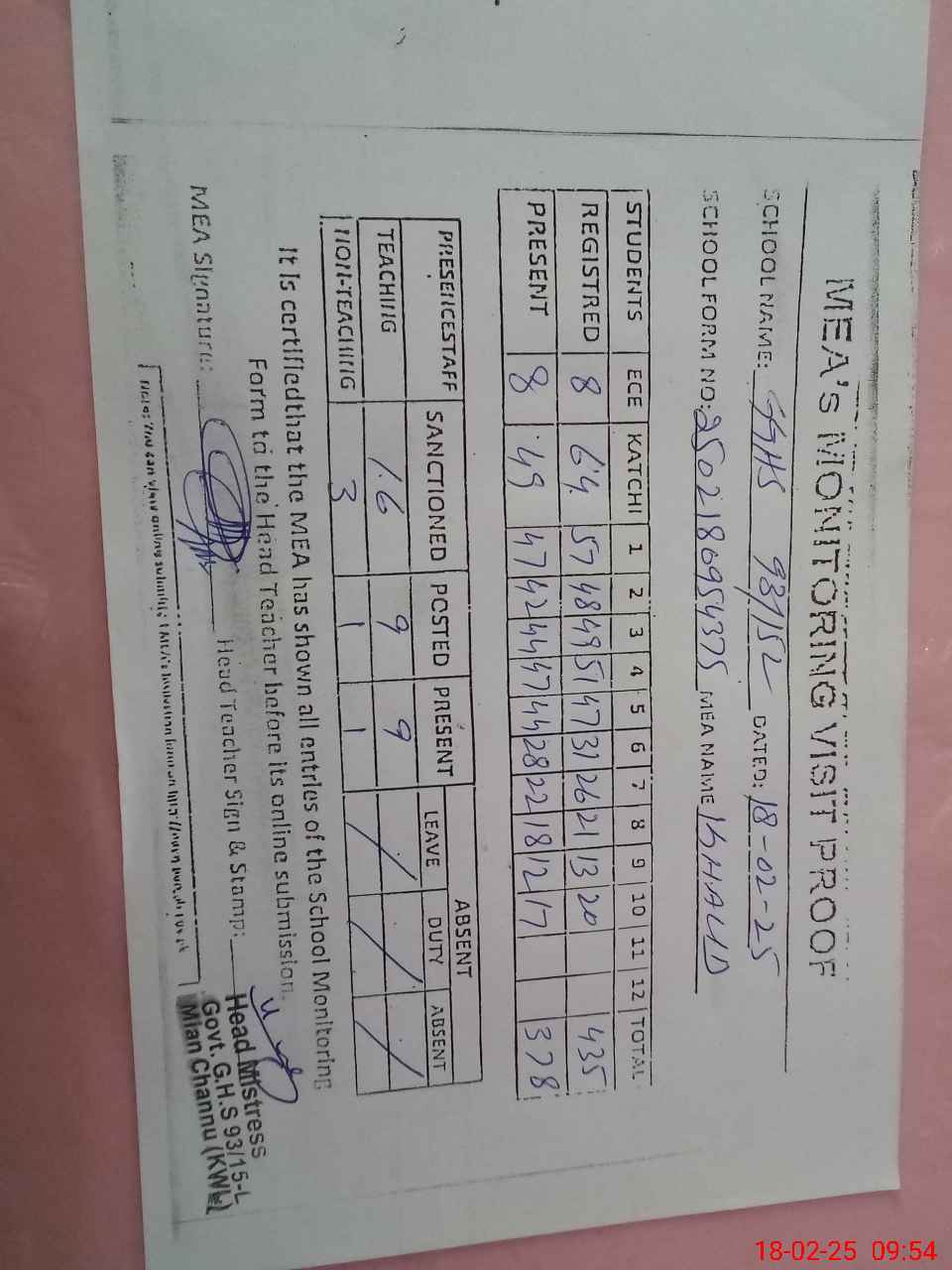 | Attendance Register | Head Teacher | MEA with School | Visit Proof |
