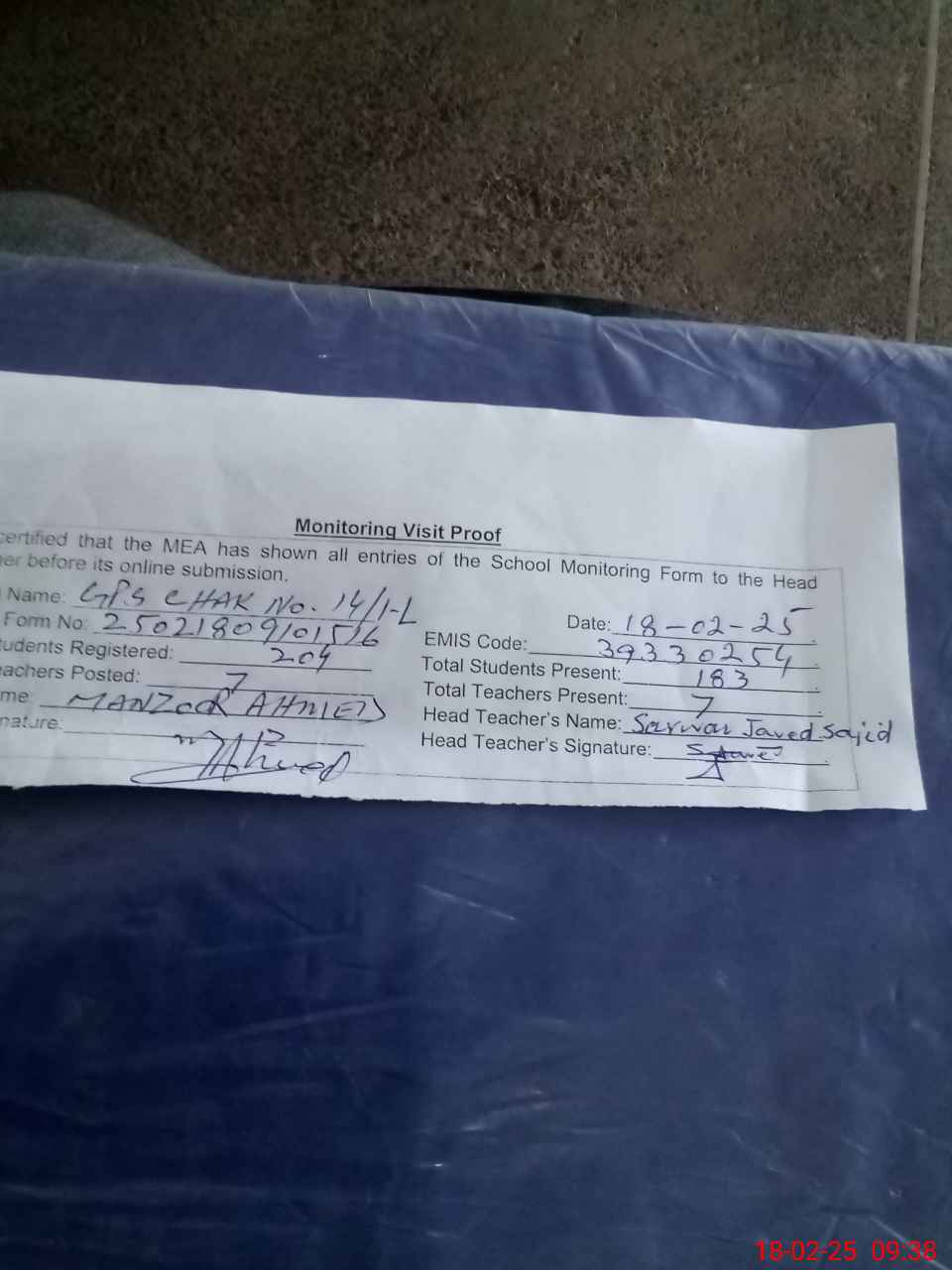 | EMIS Code: 39330254 | Name of School: GPS CHAK NO 14/1L | |||