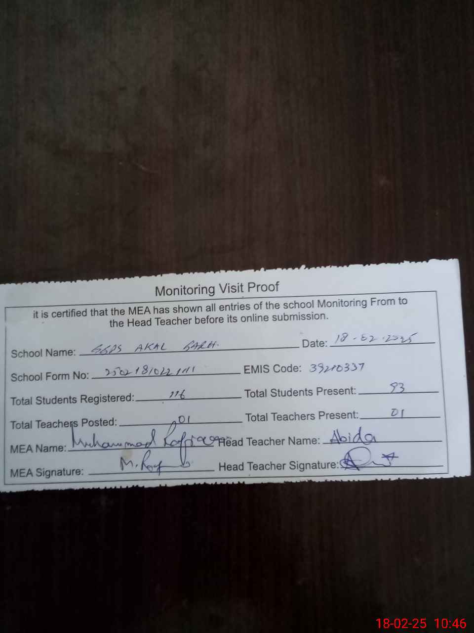 | Attendance Register | Head Teacher | MEA with School | Visit Proof |