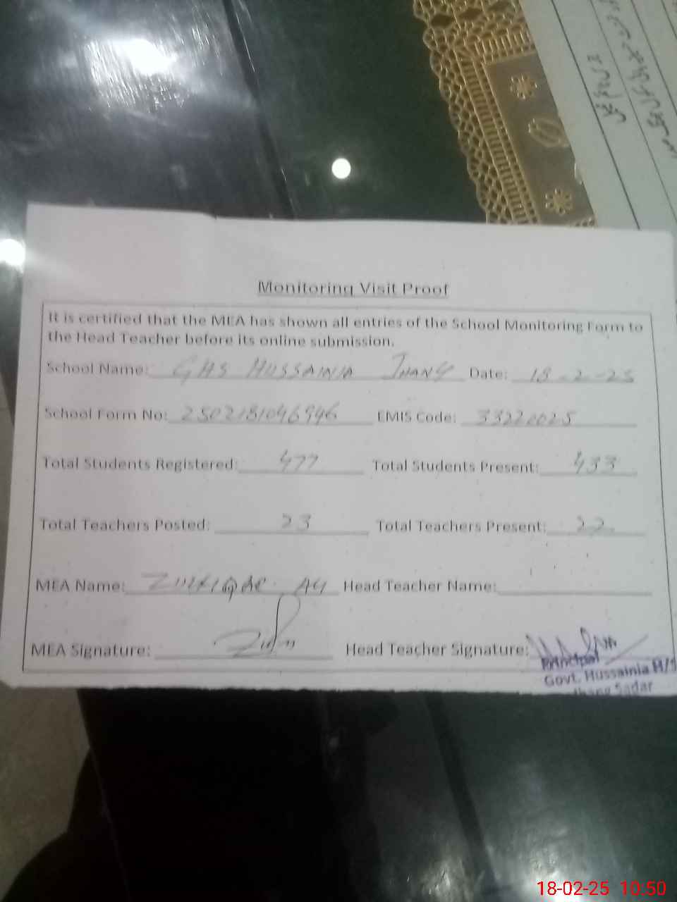 | EMIS Code: 33220025 | Name of School: GHS HUSSAINIA, JHANG | |||