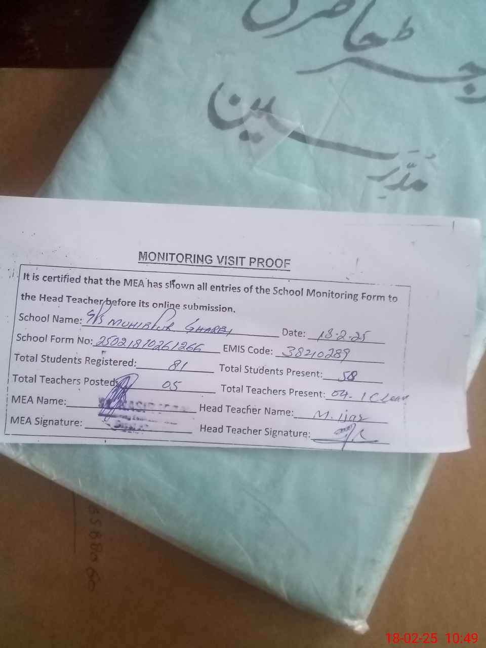 | Attendance Register | Head Teacher | MEA with School | Visit Proof |